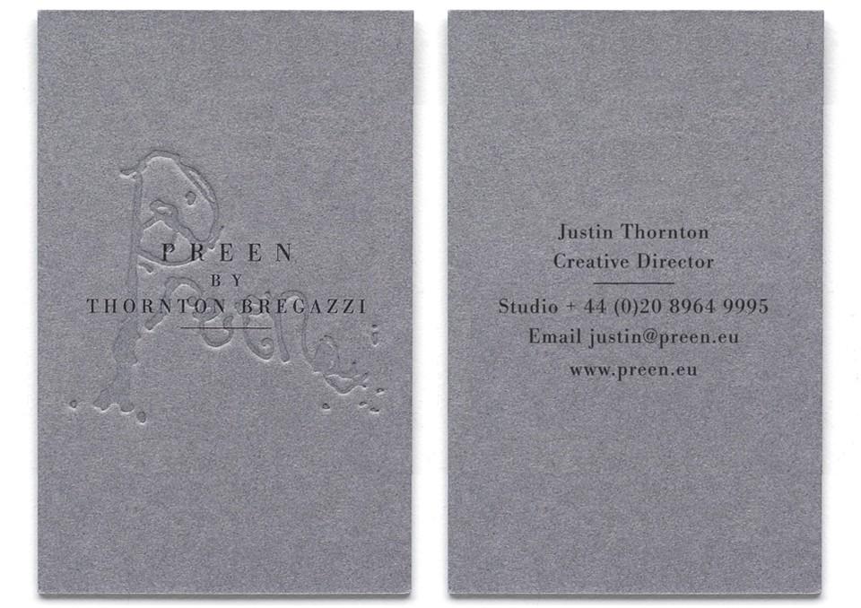 We were approached by Preen to advise with the transition from their original hand drawn logo to a newer identity that incorporated their surnames and reflected the growing emergence of the label as a worldwide brand. We spent time in specialist type libraries researching vintage letterforms as well as absorbing classic editorial designs of the 50's and 60's before settling on a 3 tiered identity, underlined to give it an established look and feel. It was important that the new identity was able to work in harmony with the original logo so we debossed the hand drawn element onto swing tickets and stationery and simply printed the new logo on top of it, creating a visual reminder of Preen's past but with a modern contemporary feel. The new identity has helped establish Preen as a global brand worn by some of the world's most influential people.